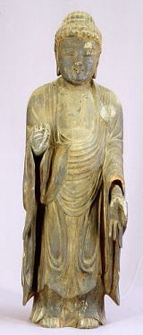・表面のホコリ・ススによる汚れ。 ・表面漆塗り膜の剥離・剥落。 ・両袖口、両指先の欠失。 ・地震による落下時の顔面への損傷(修復を行わ ない) ・足ホゾがないために安置が不安定。 [台座] ・表面のホコリ・ススによる汚れ。 ・表面漆塗膜の剥離・剥落。 ・部材間の結合の脆弱化。 [光背] ・光線の欠失。(24本)