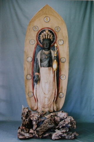 大きな欠失箇所と後補部材で使用に耐えない部材を、ヒ ノキ材を彫出して、新しく補った。(右耳朶、化仏1面、右 手指5指、左手第2指、右天衣上部)