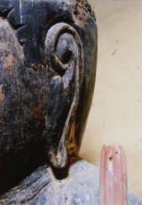 顔面や肉身部の後補表面処理を除去すべきか検討した 結果、下の彫刻表面の強度も充分にあり、除去が可能と 判断した。後補の表面処理で除去することで、像のオリジ ナリティーを回復できると考え、除去を行った。膠下地を 綿棒などに水分を含ませ、丹念に除去した。