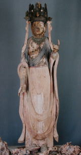 表面は、頭上面膠下地漆箔。肉身部、条帛は漆下地色。裙、天衣は彩色。化瓶、未開蓮は漆下地漆箔。