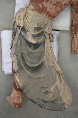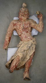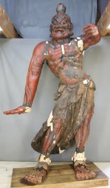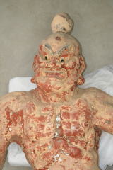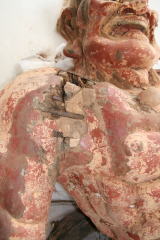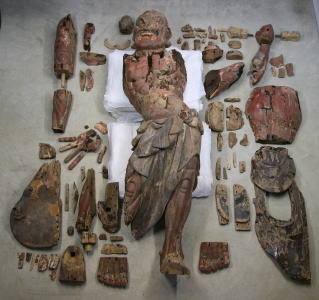・以前に足元が腐朽による損傷を被り、かなり大掛かり な修理が行われているが、その他の部分には当初の彫 刻形状をよく残していた。表面布貼り漆塗りを除去す ることによって、造像当初の彫刻の雰囲気が蘇った。 改変されていた形状も元に復し、特に左腕の角度を元 に戻した。