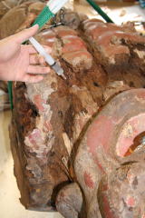 アクリル系樹脂を用いて腐朽した木質を強化した。(特 に首周り、両肩矧目、体幹部内刳り底面)