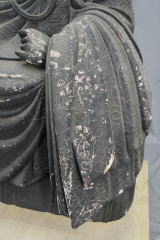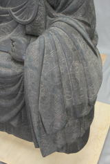 ・表面の塗膜は造像当初のものと考えるが、手間をかけて胡粉による盛り上げを行った上に黒色の彩色が施されている。費用的な問題でこのような仕上げになったのか、意図的に施されたのかは不明だが、造像時に何らかの理由で、このような仕上げとされており、修復についても現状の様子を伝えるべきかと考えた。