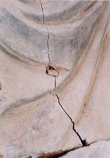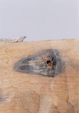 錆びた鉄釘が膨らみ 材を割ってしまった 錆びにより周辺の木質が炭化し、ぼろぼろにしてしまった様子。